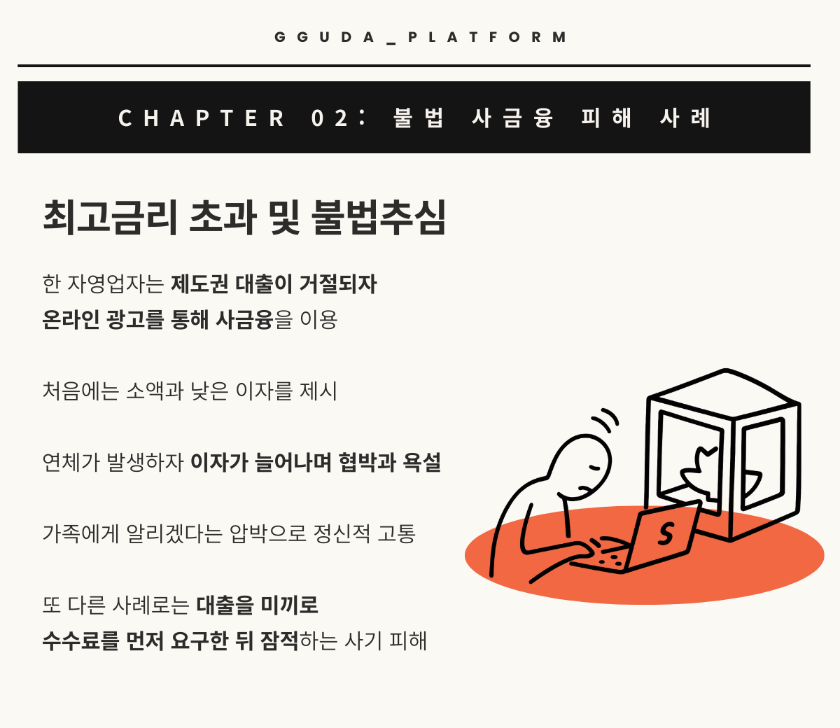 불법 사금융 거래란 법에서 정한 요건을 갖추지 않은 개인이나 업체가 대출을 하거나, 법정 최고 금리를 초과해 이자를 받는 모든 행위를 말합니다. 🧾